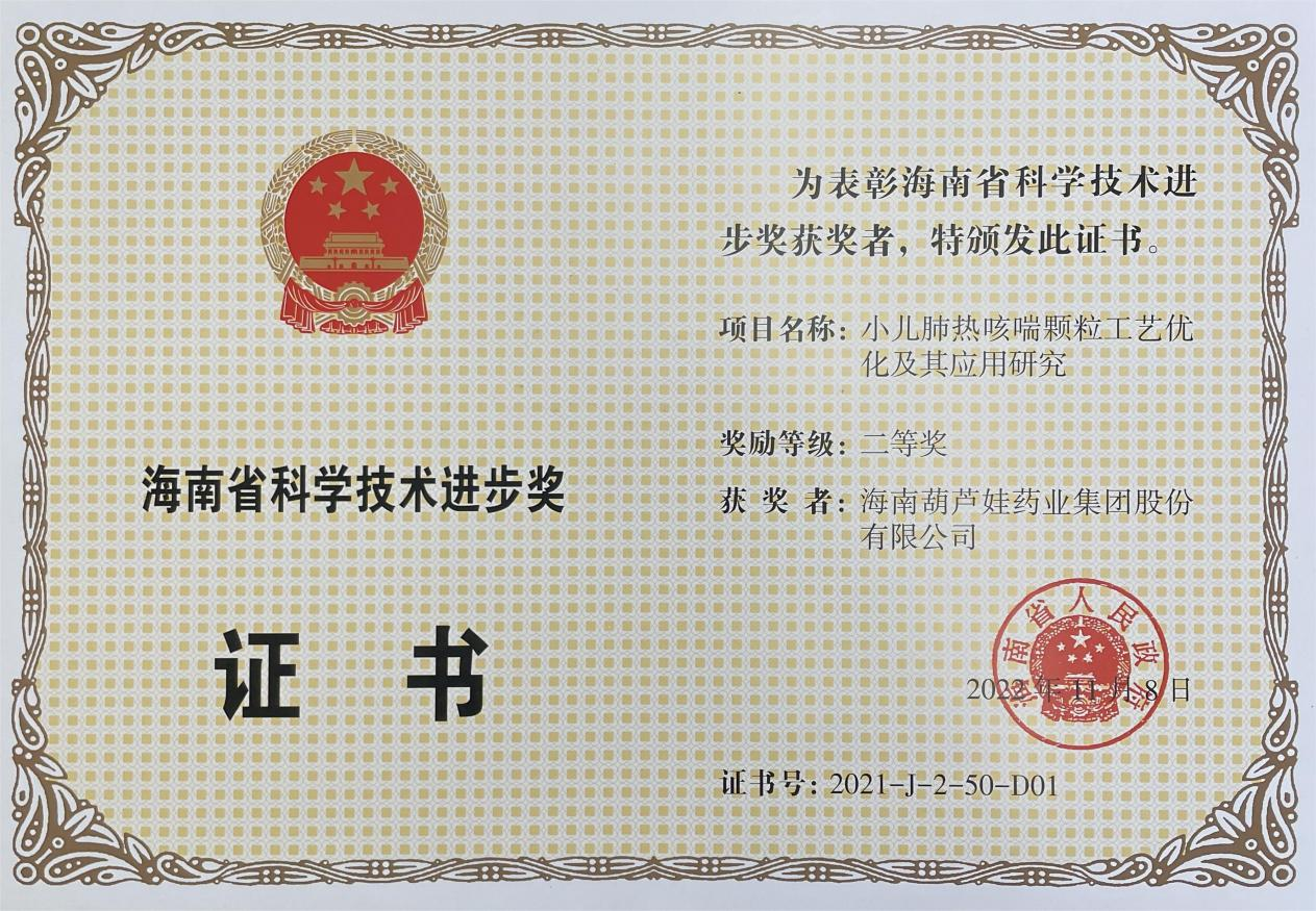 为此,小儿肺热咳喘颗粒的制备方法获得了第二十一届中国专利优秀奖(2019年),专利申请号:ZL201010134951,此次作为专利技术的应用,获得了2021年度海南省科学技术进步奖二等奖。在此之前,ks凯时牌小儿肺热咳喘颗粒还多次被授予“临床价值中成药品牌”、“中国连锁药店最具合作价值单品”,荣登“中国医药品牌榜”。